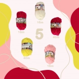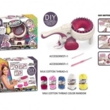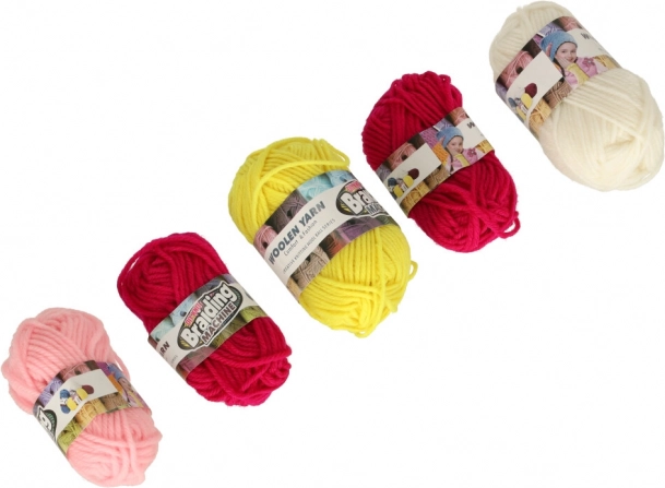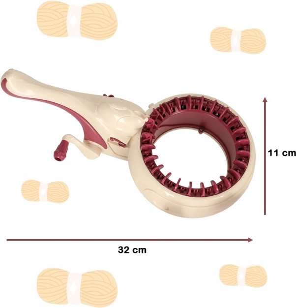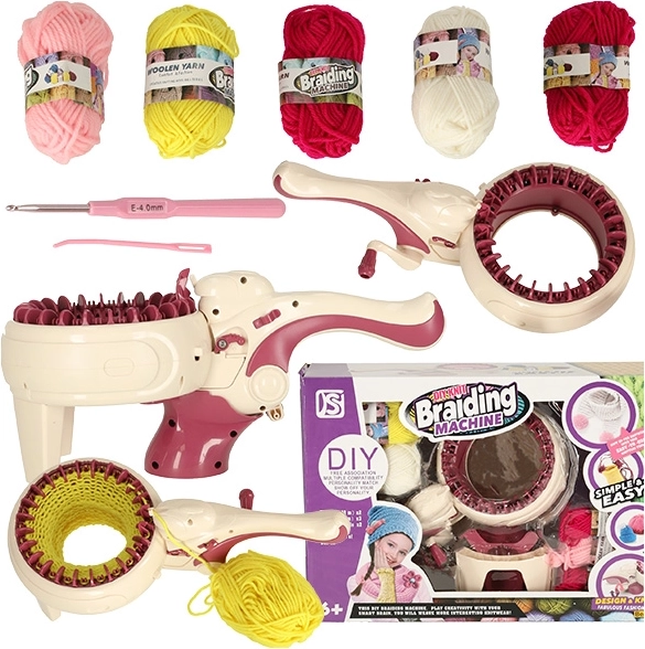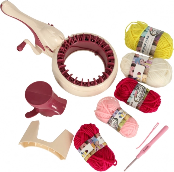 A készlet tartalmaz egy kötőgépet, 5 színű fonalat, horgot és műanyag tűt – mindent, amire szüksége van az alkotáshoz.