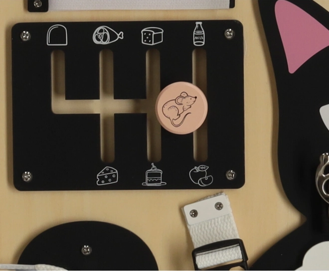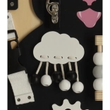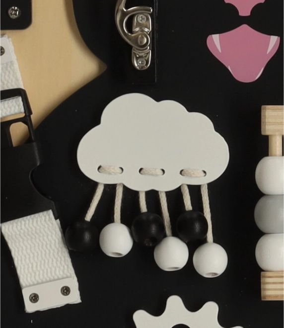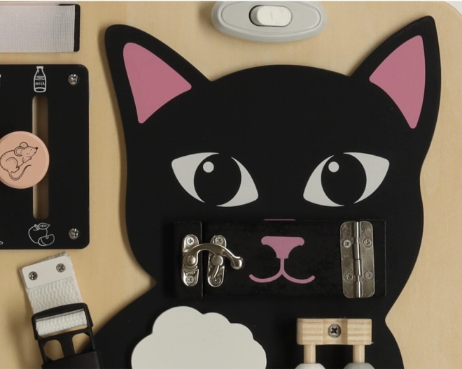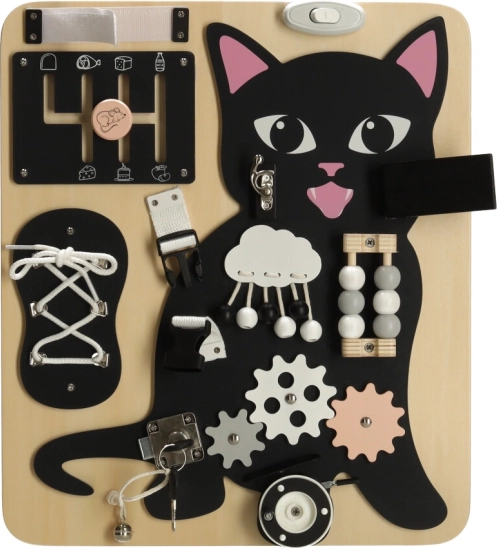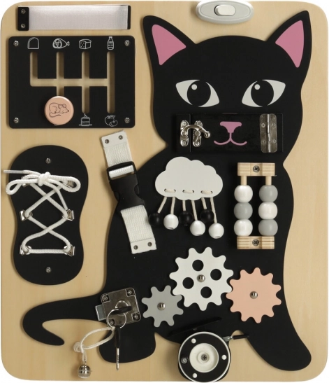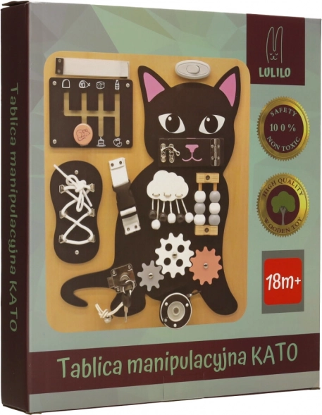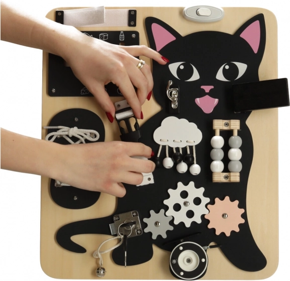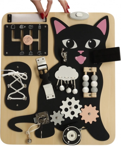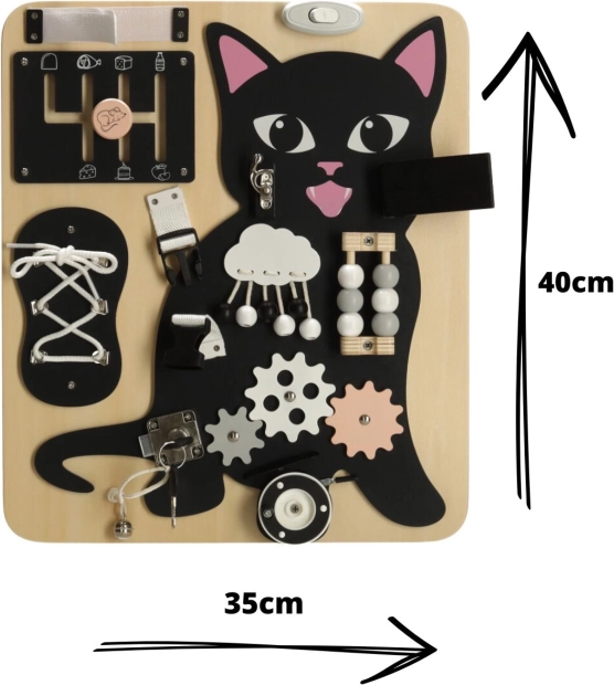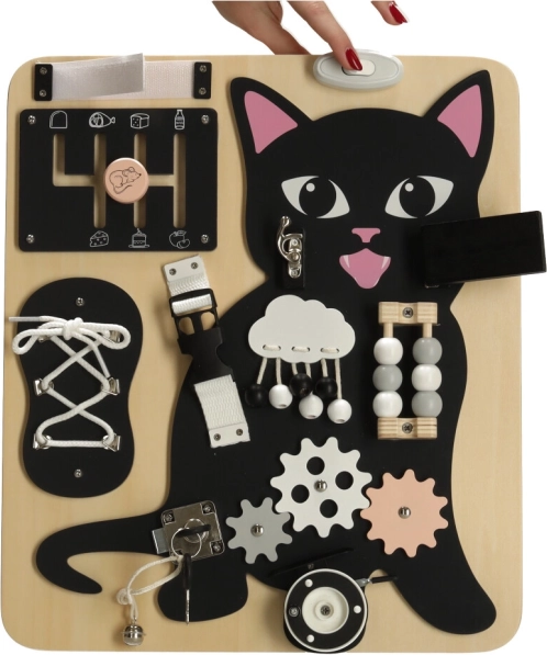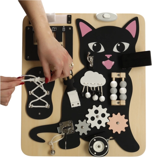 A Lulilo érzékelő tábla cicás változata a gyermekek motorikus képességeinek támogatására és problémamegoldó képességeik fejlesztésére készült. Különböző interaktív elemeket tartalmaz, mint például cipőfűzők, zárak és gyöngyök, amelyek órákig tartó szórakozást és tanulást biztosítanak a gyermekek számára. Tartós fából és fémből készült a hosszú távú használatra.