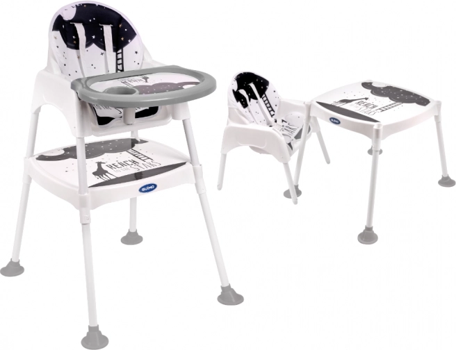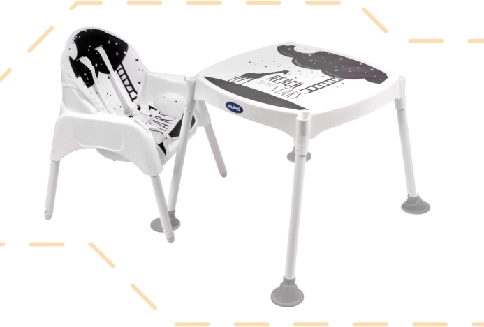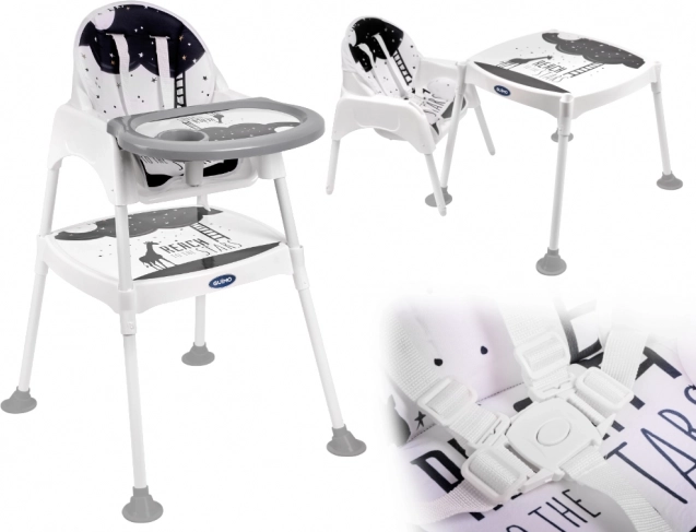A 3 az 1-ben etetőszék csillagokkal kényelmesebb és praktikusabb étkezéseket biztosít gyerekek számára. Ez a sokoldalú etetőszék babakocsi, szék és asztal is lehet, ami játék vagy rajzolás során is hasznos lehet.