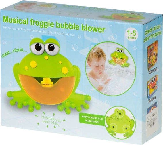 A buborékkészítés közben a béka játékos dallamokat játszik, igazi mini show-vá varázsolva a fürdést.