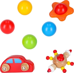 A készletben színes golyók, piros fa kisautó és figurás kiegészítők találhatók a változatos játékokhoz és versenyekhez.