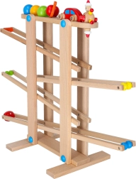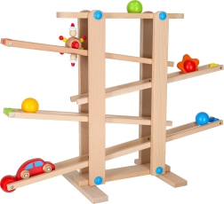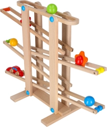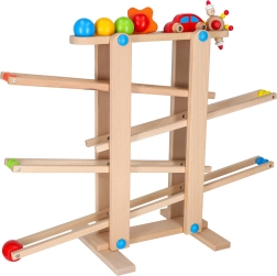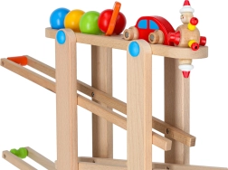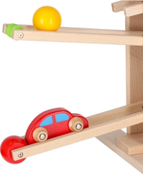 Minden alkatrész gondosan csiszolt a gyermekkéz számára biztonságos fogás érdekében. A versenyjáték fejleszti a kéz–szem koordinációt, az ok-okozati összefüggések felismerését és a türelmet. A készlet könnyű önszereléssel érkezik, a csomag minden szükséges elemet tartalmaz, beleértve a színes golyókat és a fa kisautót.