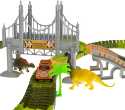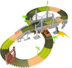 Ez a dinoszauruszokkal és autókkal felszerelt versenypálya végtelen lehetőséget kínál a kreatív szórakoztató összeszerelésre. A gyerekek folyamatosan változtathatják a pálya alakját, ami támogatja motorikus készségeiket és szem-kéz koordinációjukat.