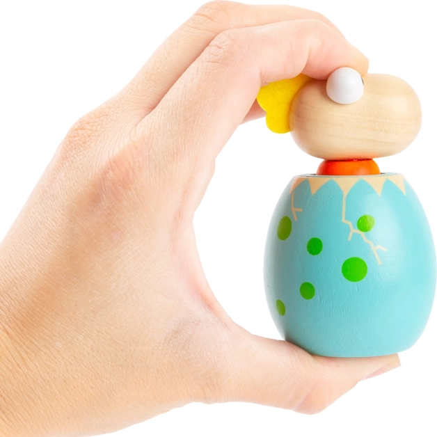 A vidám kis lény színes tojásból kikukucskáló dizájnja a képzeletbeli játékra csábít, és támogatja az érzékek természetes fejlődését. A kompakt méretek remekül illeszkednek a kis kezekbe, megkönnyítve a fogást és az első manipulációt.