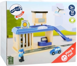 A valósághű small foot rendőrállomás támogatja a gyerekek fantáziáját és a finommotorika fejlődését. Két szint, torony heliporttal, működő cella kihúzható ráccsal és parkoló rámpa alkotják az átgondolt játékkörnyezetet. A csomag része egy rendőrautó, egy helikopter és két mozgatható figura – rendőr és bűnöző – a végtelen játékszcenáriókhoz.