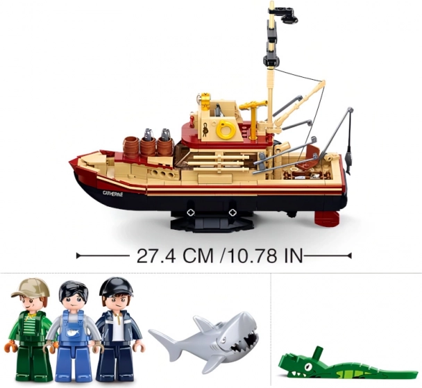 A Catherine halászhajó építőkészlet örömet nyújt a modellezésben, és ideális gyerekek és felnőttek számára egyaránt, akik szeretik a kihívásokat. Az összeszerelt hajó hossza több mint 27 cm, és kiegészül egy valósághű cápával. Az építőkészlet három innovatív figurát tartalmaz, forgatható és mozgatható testrészekkel, amelyek nagyobb rugalmasságot biztosítanak játék közben.
