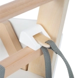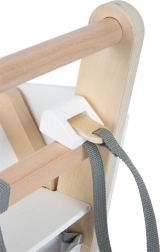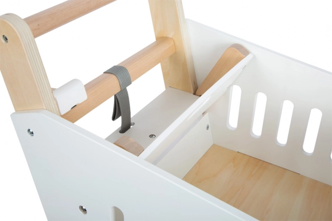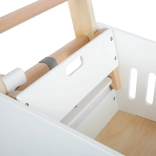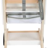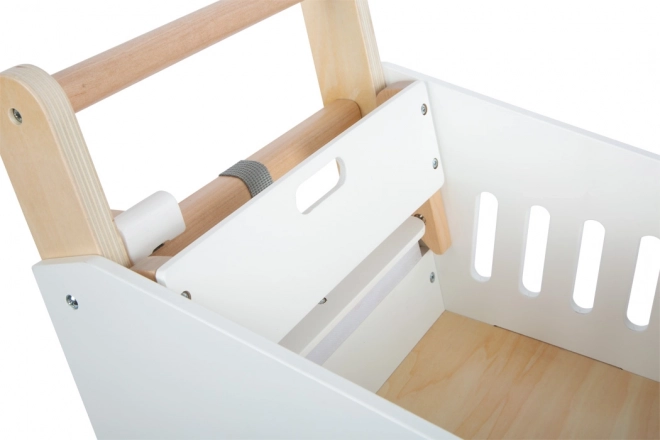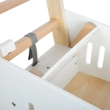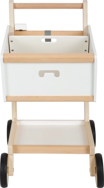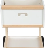 Ez a gyermek bevásárlókocsi erős fából készült és gumírozott kerekekkel van felszerelve a halk és sima mozgás érdekében. Ahogy az igazi szupermarketekben is, mágneses chip használatához van lehetőség a tartóban. A kocsi tágas kosarat kínál különféle tárgyak számára és extra tárolóhelyet az alsó részen.