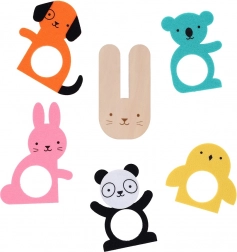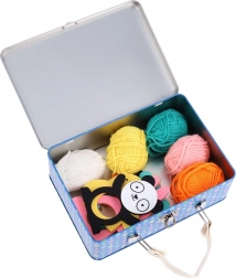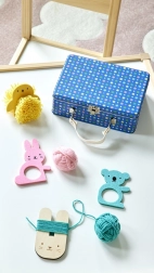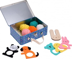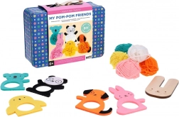 A kreatív készlet öt színes fonalat, öt filc állatot és egy fa pomponkészítőt tartalmaz, mindent, ami saját pomponbarátok készítéséhez szükséges.