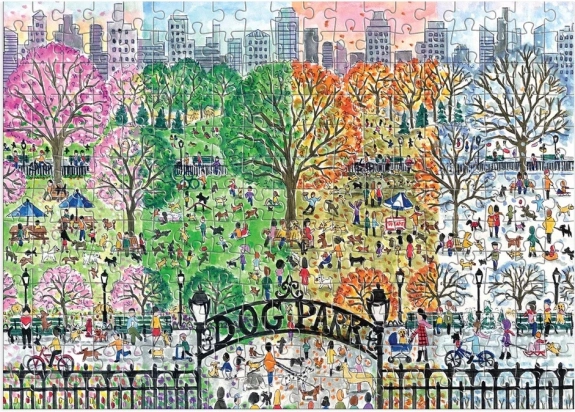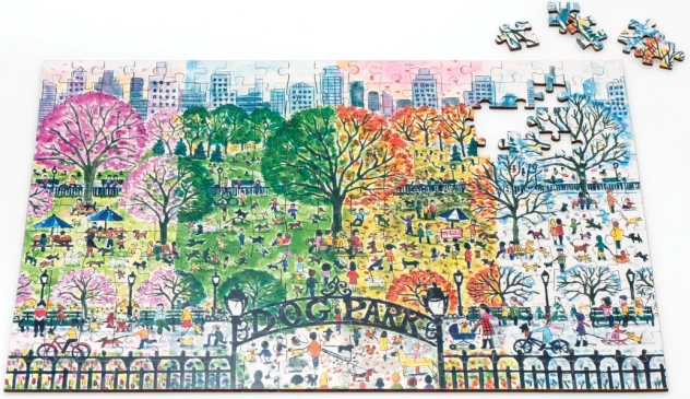 A díjnyertes illusztrátor eredeti Kutyapark-négy évszak motívuma színekkel, részletekkel és örömmel tölti meg minden egyes darab kirakását.