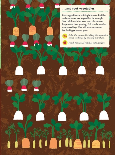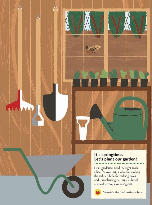 A kis kertészek megtanulják felismerni a különféle zöldség- és gyümölcsfajtákat, megtudják, hogyan kell őket helyesen ültetni, öntözni és gondozni, valamint milyen eszközökre van szükségük. A matricáknak és a kvíznek köszönhetően a tanulás szórakoztató, motiváló és tele van felfedezésekkel.