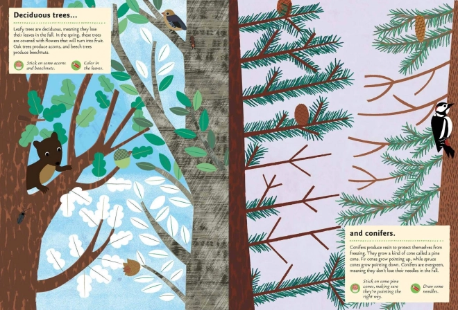 Ez az eredeti foglalkoztató könyv játékos formában mutatja be az erdei világ sokféleségét – a tobozoktól és moháktól a virágokig és bogyókig. A matricák és a rajzolás segítségével a kis felfedezők megismerik a természetet és fejlesztik készségeiket. Olivia Cosneau illusztrációi egyedi vizuális stílust kölcsönöznek a könyvnek.