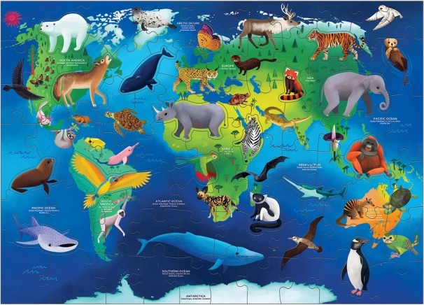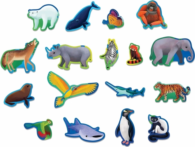 Ez az edukatív puzzle segít a gyerekeknek jobban megérteni a veszélyeztetett állatfajokat a különböző kontinenseken és óceánokon. A hagyományos darabokon kívül a kirakó 17 speciálisan formázott elemet is tartalmaz, amelyek további szórakozást és kihívást nyújtanak.