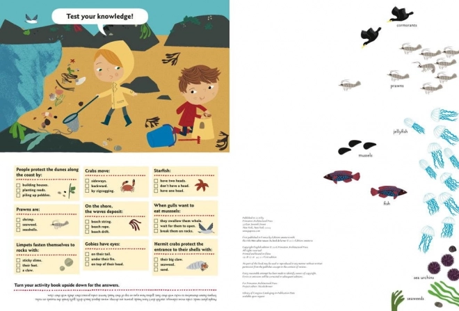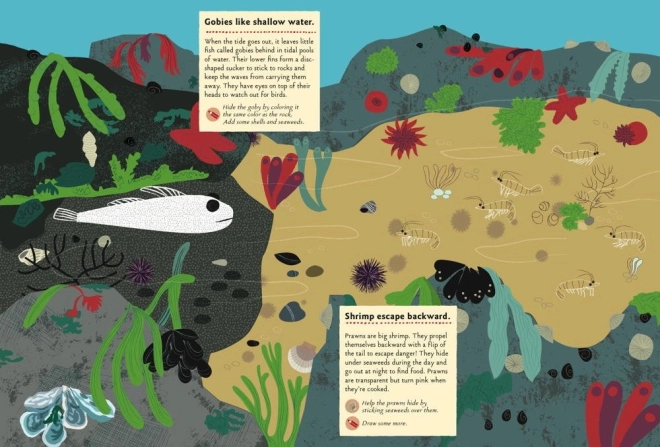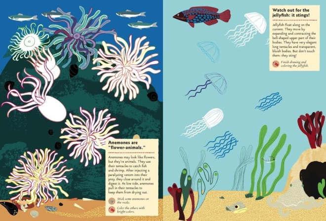 - 24 aktivitás, többek között medúzák és tengeri rózsák színezése, a rák testének kiegészítése, kagylók, nádas és tengeri csillagok rajzolása