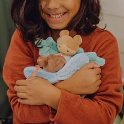 - Biztonságos születéstől – hímzett szem és száj, apró alkatrészek nélkül.