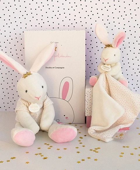 Ez a DOUDOU ajándékszett egy fehér plüss nyuszit tartalmaz pöttyös puha rongyival, kompakt, 10 cm-es méretben, amelyet a babák már az első hetektől könnyen meg tudnak fogni. A selymes anyag és a finom színek segítik a megnyugvást és a baba érzékszervi fejlődését.
