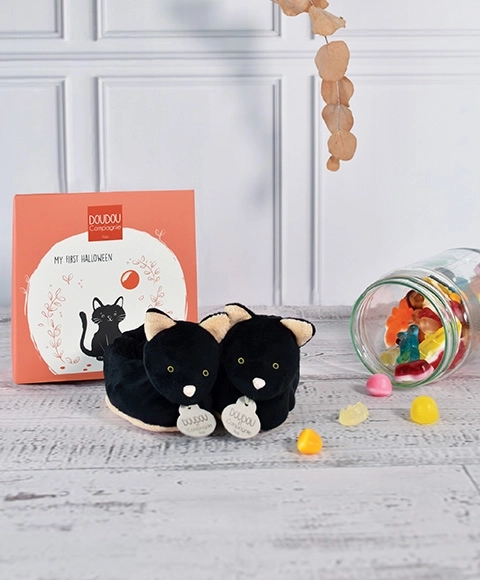 Aranyos és pihe-puha cipőcskék fekete macska motívummal, 0–6 hónapos babáknak, a DOUDOU márkától. A kis lábakat melegen tartják, kellemes tapintásúak, és remekül illenek Halloweenre éppúgy, mint a mindennapi viseléshez. Díszdobozban kerülnek szállításra, összhangban az európai CE-szabványokkal.