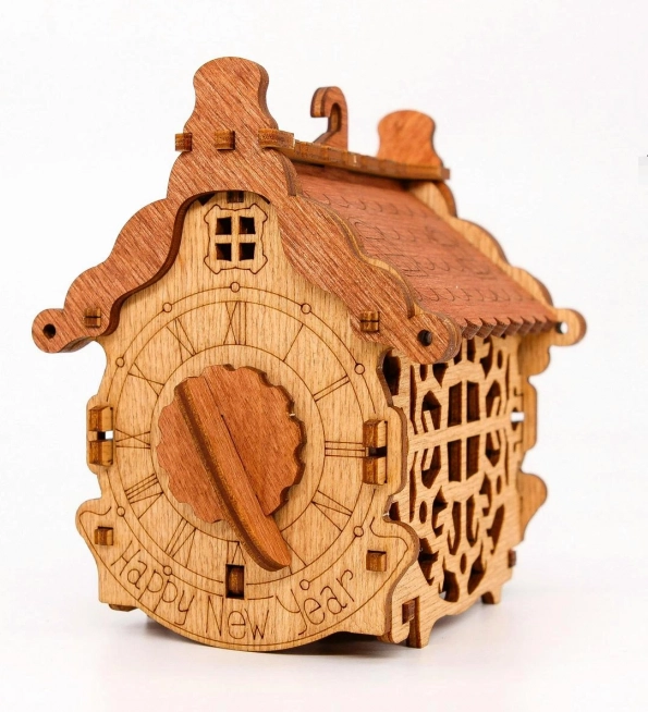 Ez a dekoratív, házikó alakú fa doboz óraszámlappal és „Happy New Year” felirattal a rafinált fejtörő mechanizmust stílusos dizájnnal ötvözi. Belül helyet rejt egy apróságnak, amelyhez a megajándékozott csak a titkos zár megfejtése után fér hozzá. A felakasztható szemnek köszönhetően könnyen elhelyezhető a karácsonyfán vagy egy ágon.