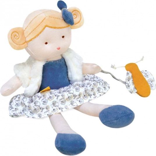 Ez a bájos baba a természet harmonikus színárnyalatait hordozza, és környezetbarát, gyermekek számára születéstől kezdve megfelelő anyagokból készült. A baba öltözéke aranysárga, okker, ecru és kék színben pompázik, melyek felébresztik a gyermekek érzékeit.