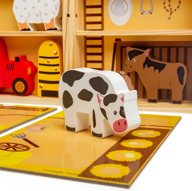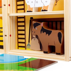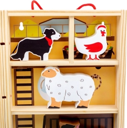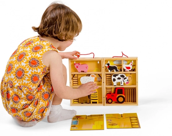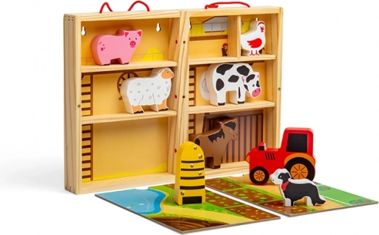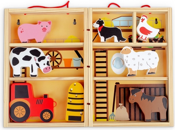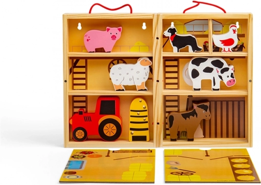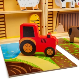 A készlet részei: állatok (ló, tehén, kutya, disznó, juh), méhkaptár és traktor. Élénk színek és biztonságos, tömör fából készült kialakítás.