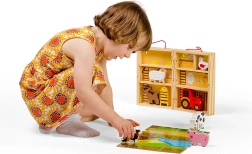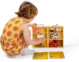 A fa állatfigurák és a traktor nyitott játékra ösztönöznek. A gyerekek gyakorolják a fogást, a kéz–szem koordinációt és saját történeteik elmesélését.