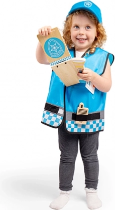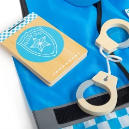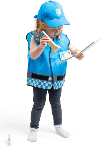 A BIGJIGS TOYS rendőr jelmez serkenti a fantáziát és a szerepjátékot. A kék mellény fényvisszaverő elemekkel, tépőzárakkal és rendőrségi részletekkel, állítható pamut sapkával és fából készült kiegészítőkkel élethű rendőri élményt nyújt.