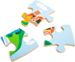 A 40 × 40 cm-es méret bőséges teret kínál a közös kirakáshoz a szülőkkel, de az önálló játékhoz is. A sima fa elemek jól kézbe illenek, tartósak és biztonságosak a 3 évesnél idősebb kis építők számára.