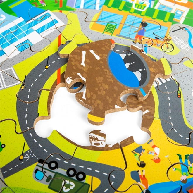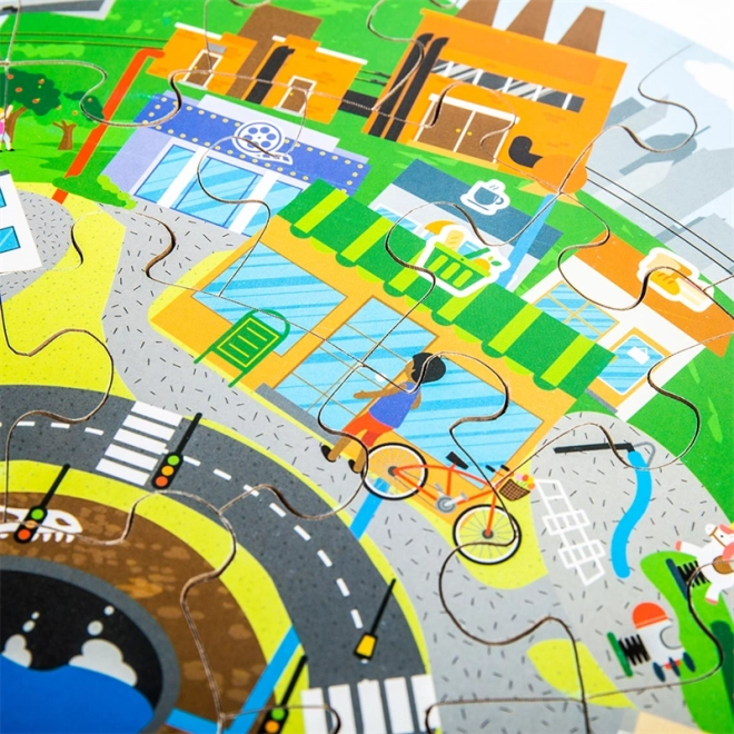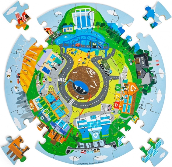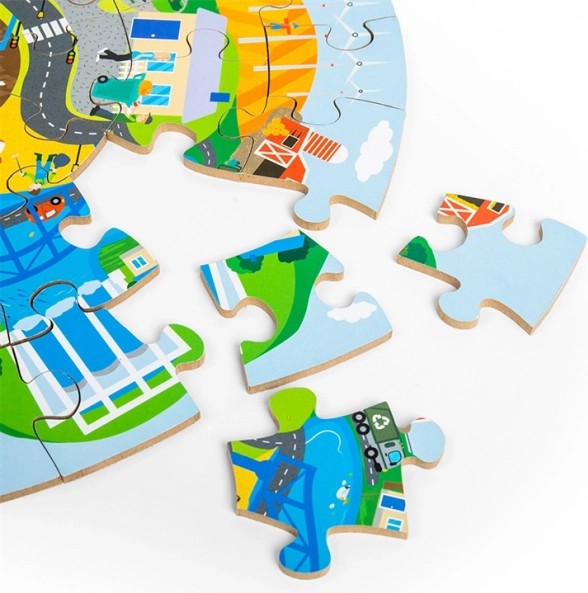 A minőségi, kör alakú fa puzzle remek választás első oktató kirakóknak. Az élénk színeknek és a városi illetve természeti jeleneteknek köszönhetően a gyerekek könnyen eligazodnak a hulladékszelektálás és a környezetvédelem témájában.