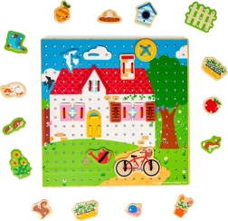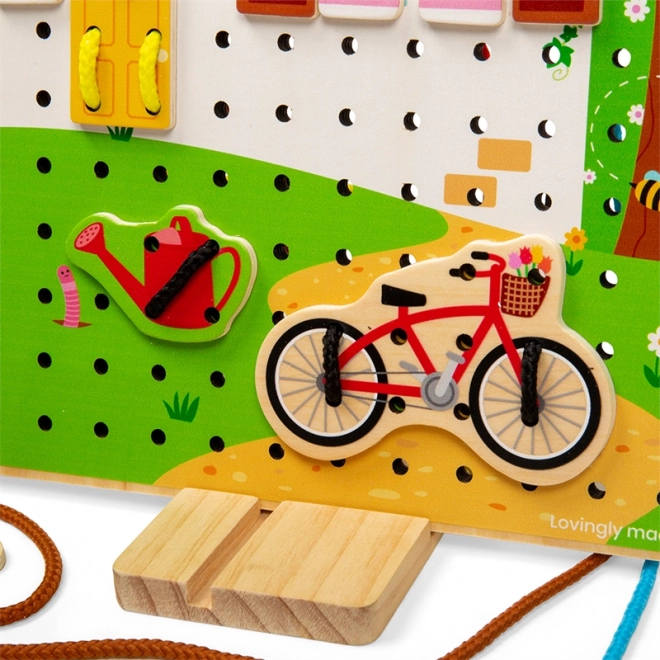 Fedezze fel a kreatív fűzősjátékot, amely fejleszti a gyerekek fantáziáját és kézügyességét. A színes zsinórokat és a fa alakzatokat, mint az ablakok, a kerék vagy a felhők, a gyerekek a lyukacsos táblába fűzik, és saját képeket állítanak össze. A játék minőségi fából és textilből készült, ragyogó színekkel, támogatja a finommotorikát, a koordinációs készségeket és a türelmet, és órákon át tartó szórakozást nyújt.