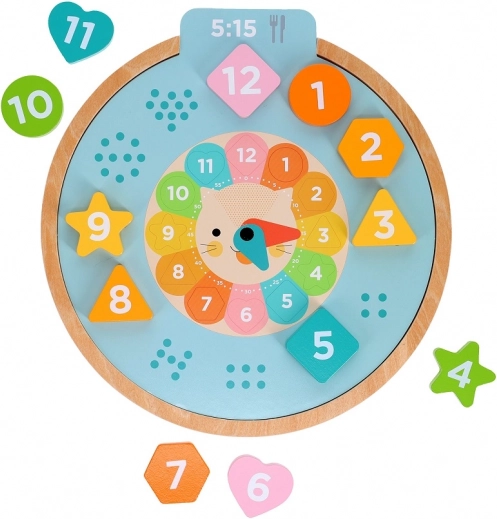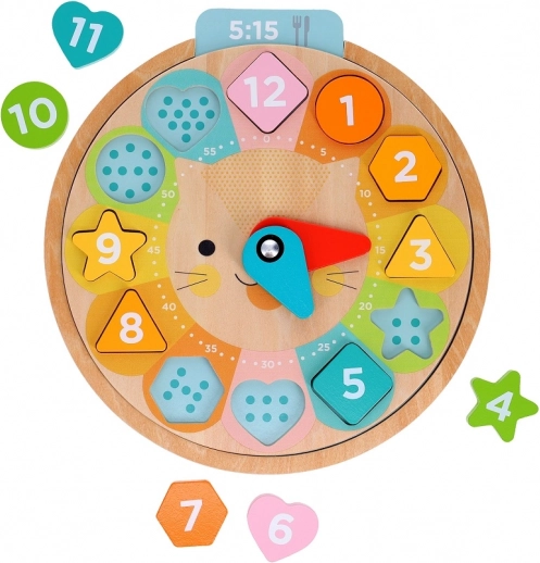 Rendelkezik mozgatható mutatókkal és alakzatokkal, amelyeket a gyerekek a megfelelő helyre illeszthetnek, ez elősegíti a koordinációt és a finommotoros készségeket.
