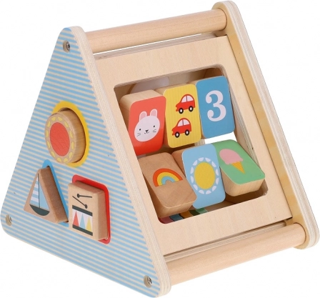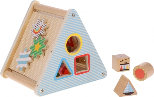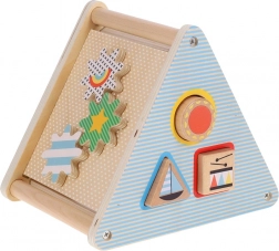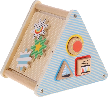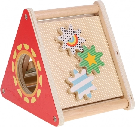 Játék különböző kivágott nyílásokat és fogaskerekeket tartalmaz, amelyek segítik a finommotoros készségek fejlesztését.