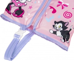 A maximális kényelem és biztonság érdekében elülső, takarórésszel ellátott cipzárral és állítható lábközti pánttal rendelkezik, amely megakadályozza a mellény felcsúszását. A UPF 50+ védelmű textilfelület kellemes tapintású és ellenáll a fakulásnak. A mellény úszásoktatást segítő eszköz, amelyet mindig felnőtt felügyelete mellett kell használni.