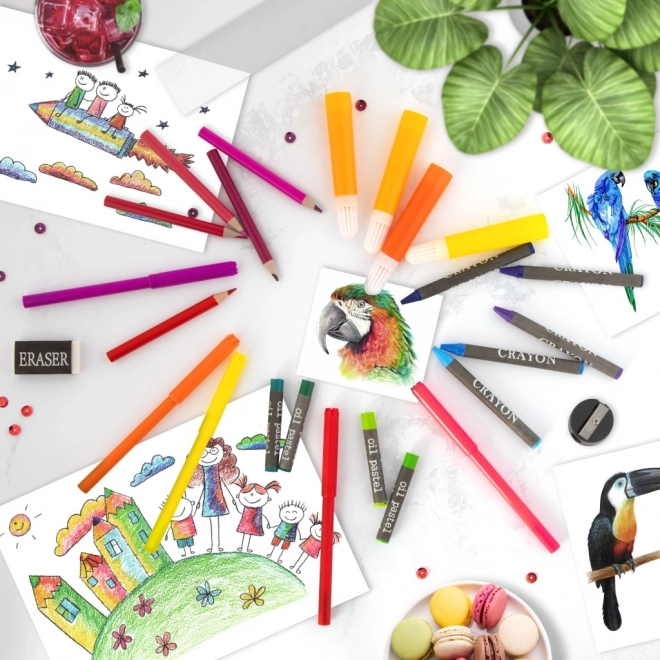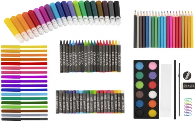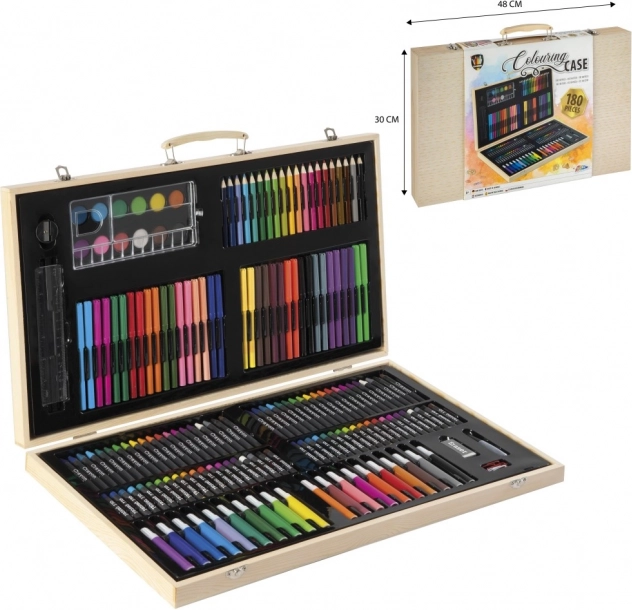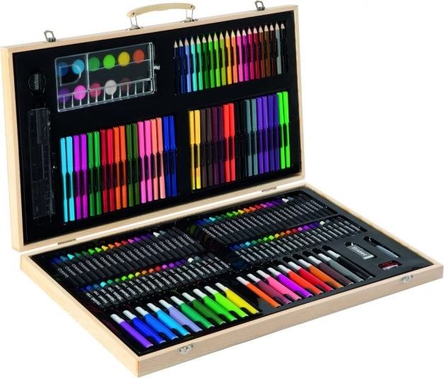 Ez a praktikus, fából készült festőkoff er gazdag felszereltséget kínál a képzelet és kreativitás fejlesztéséhez. A készletben színes ceruzák, filctollak, vízfestékek és további segédeszközök találhatók, melyekkel könnyedén készíthet élénk illusztrációkat, vázlatokat és színes képeket. A masszív koff ernek köszönhetően minden elem áttekinthetően rendszerezett és biztonságosan tárolt.