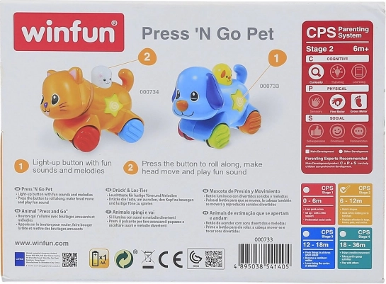 Macska Press 'N Go Pet egy színes játék, amely támogatja a gyermek motorikus képességeit. Vidám színei, hangeffektusai és interaktív elemei miatt ideális társ a 6 hónapos kortól kezdődő kicsinyek számára.