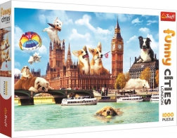 - A puzzle kutyák képeinek kollázsa, különböző fajtájú közegben, az erősen felismerhető London városában.