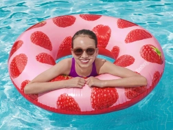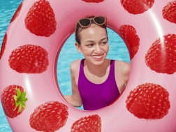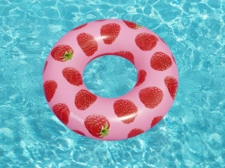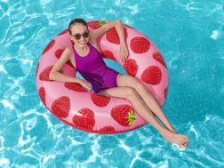 Élvezd a nyarat a Bestway úszógumival, amelynek friss málnás illata és stílusos gyümölcsmintája van. Tartós anyag, biztonsági szelep a könnyű felfújáshoz és leeresztéshez, valamint akár 90 kg teherbírás – tökéletes kiegészítő medencéhez és strandra egyaránt.