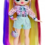 Színes baba többszínű hajjal, divatos ruhákkal és feltűnő kiegészítőkkel, mint például 'STUNNER' feliratú fülbevalók.