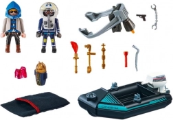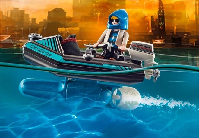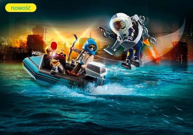 Minden készen áll az akcióra a Playmobil Városi Akcióval. A jetpackkel felszerelt rendőr gyorsan közeledik a tolvajhoz, aki az ellopott műalkotásokkal menekül a csónakon. Az őr ügyessége és felszerelése révén képes hamar elfogni a bűnözőt és visszajuttatni az értékes tárgyakat a múzeumba.