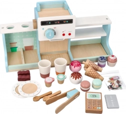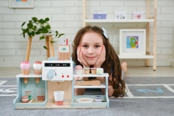 Ez a fából készült fagyizó és kávézó autentikus élményt nyújt a gyerekeknek egy kis bisztró kiszolgálásából. A színes kiegészítőknek, forgatható gomboknak és a kávéfőzőn, valamint a fagyis pulton található élethű elemeknek köszönhetően a gyerekek fejleszthetik finommotorikájukat, kommunikációjukat és képzelőerejüket.