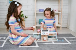 A gyerekek „lefőzhetik” az eszpresszót, tekerhetik a gombokat és kiszolgálhatják a vendégeket, akárcsak egy kis kávézóban. Remek alap a barista szerepjátékhoz.