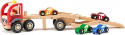Fedezze fel a szórakoztató fa autószállítót négy színes versenyautóval, amely fejleszti a finommotorikát és a kreatív játékot. Masszív fa kivitel gumírozott kerekekkel a vontatón és műanyag kerekekkel az autókon a sima gurulásért és a hosszú élettartamért. Ideális játék 3 éves kortól.
