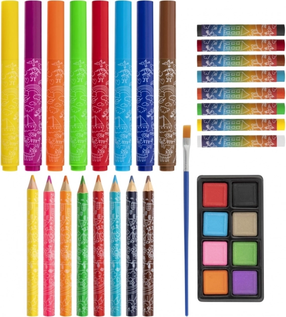 A 33 darabos készlet széles szín- és eszközkínálatot nyújt festéshez, rajzoláshoz és színezéshez – ideális kezdő kis művészeknek.