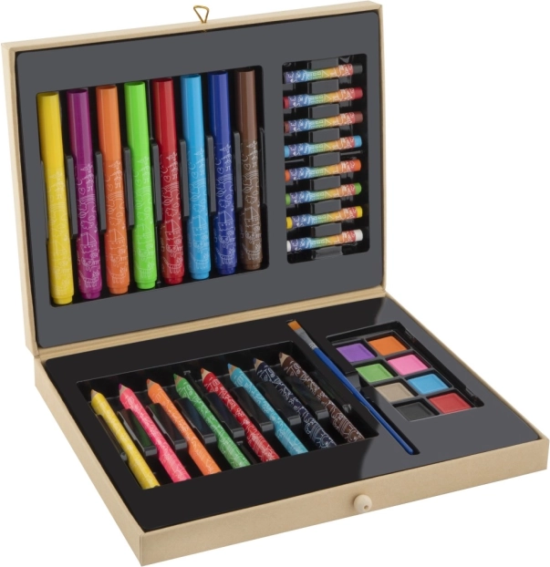 A masszív kartontokban minden eszköz áttekinthetően a helyén marad, megkönnyítve a tárolást és a hordozást. A készlet remek választás otthoni alkotáshoz, iskolai projektekhez, illetve ajándéknak is, amely minden kis alkotónak örömet szerez.
