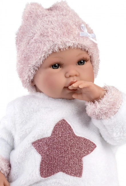 A mellkas megnyomására a baba azt mondja: „mama”, „papa”, és autentikus síró hangot ad ki, ami támogatja a gondoskodó játékot és az empátiát.