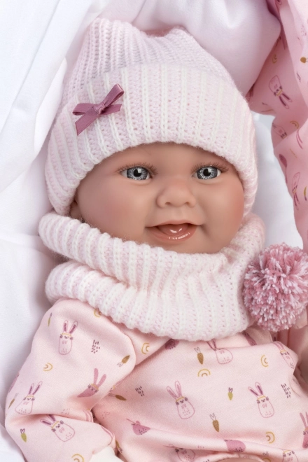 Ez a Llorens New Born kislány élethű baba valósághűen adja vissza egy kisbaba megjelenését teljes vinyl testtel, amelyen minden aranyos részlet látható. A vízálló anyagnak köszönhetően a baba óvatosan fürdethető (kerülje a szempillák benedvesítését). A karok és lábak ízületekkel rögzítettek, így a baba pozícionálható és önállóan is tud ülni.