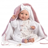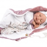 Ez a Llorens New Born realisztikus baba az élethű szülős játékhoz készült. A puha textil test kellemes tapintású, a műanyag végtagok ízületei természetes pozícionálást és ülést biztosítanak. A mellkas megnyomására a baba kimondja: „mama”, „papa”, és élethű sírást ad ki, ami támogatja az empatikus játékot.