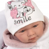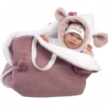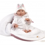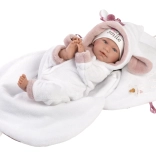 Beszélő baba puha textiltesttel, amelynek mellkasára nyomva azt mondja: „mama”, „papa”, és valósághű síró baba hangot ad ki. A karok és lábak ízülettel kapcsolódnak a testhez. A baba mozgatható és ülni is tud. A csomagban található cumi csak kiegészítő. Méret: 42 cm. Kézzel készült Spanyolországban, ajándékdobozban csomagolva. Ajánlott életkor: 3 éves kortól. A babához további eredeti ruházat vásárolható a Llorens NEW BORN kínálatából 40–42 cm vagy 43–45 cm méretben. A csomag tartalma: 3 x LR44 gombelem a cseréjükre vonatkozó útmutatóval. Az elemek fogyóeszköznek minősülnek, ezért lemerülésük nem ad okot a baba reklamációjára.