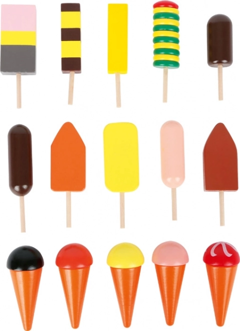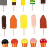 A változatos fa fagylaltok és jégkrémek készlete alkotó játékra, válogatásra és kombinálásra inspirálja a gyerekeket.