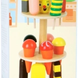 A SMALL FOOT háromszintes fagylaltállvány ideális kiegészítő a gyerekkonyhába vagy a kis boltba. A színes lazúrral kezelt fa fagylaltok és jégkrémek (kb. 8–10 cm) könnyen behelyezhetők az előkészített nyílásokba, és végtelen adag kreatív játékra csábítanak.