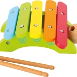 Ez a színes, fa csiga alakú xilofon szórakoztató első lépéseket kínál a gyerekeknek a zene világába. Az öt élénk színű fém lamella tiszta hangokat ad, támogatja a ritmusérzéket és a szem–kéz koordinációt. Az ütők okosan a „csápokban” vannak elrejtve, így mindig kéznél vannak.