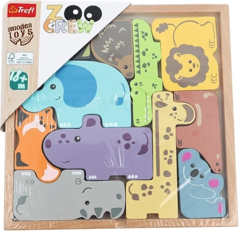 A TREFL márka ZOO CREW kollekciójának vidám, fából készült fejtörő kirakója kicsiknek és nagyoknak egyaránt örömet okoz. 11 darab, állat alakú elemet tartalmaz, amelyeket a gyerekek a körvonalak szerint helyeznek el a dobozba. A játék fejleszti a finommotorikát, a logikus gondolkodást és a térbeli képzelőerőt, és már 18 hónapos kortól ajánlott.